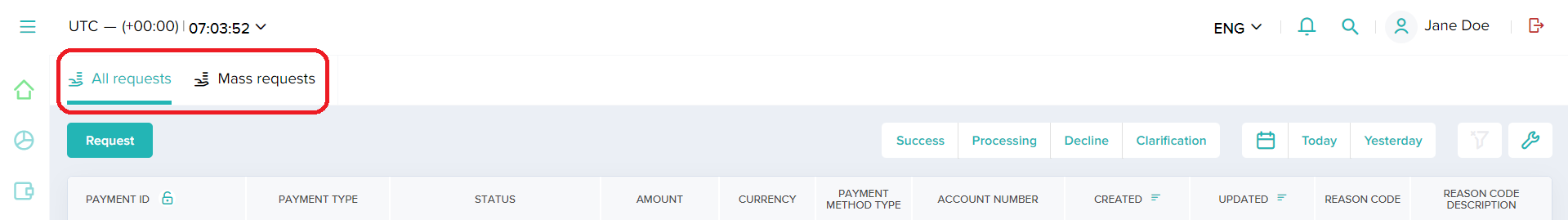 The clock with an option to select the time zone is located on the left of the main menu. Selecting the time zone affects the way the data is shown in the payments list, but it does not impact the way business days are determined and counted. Business days for reporting purposes are set in UTC + 00:00.