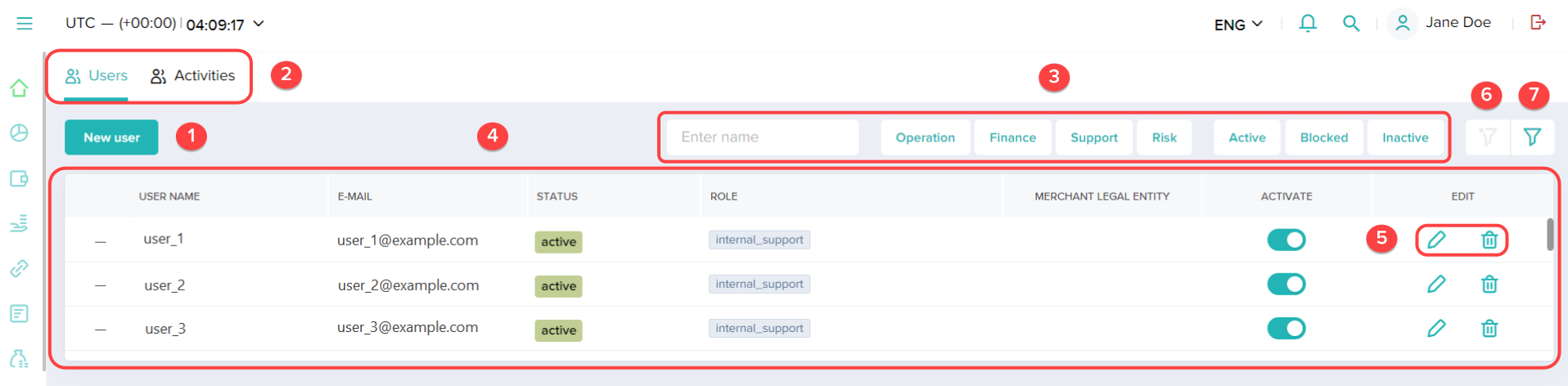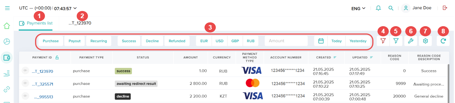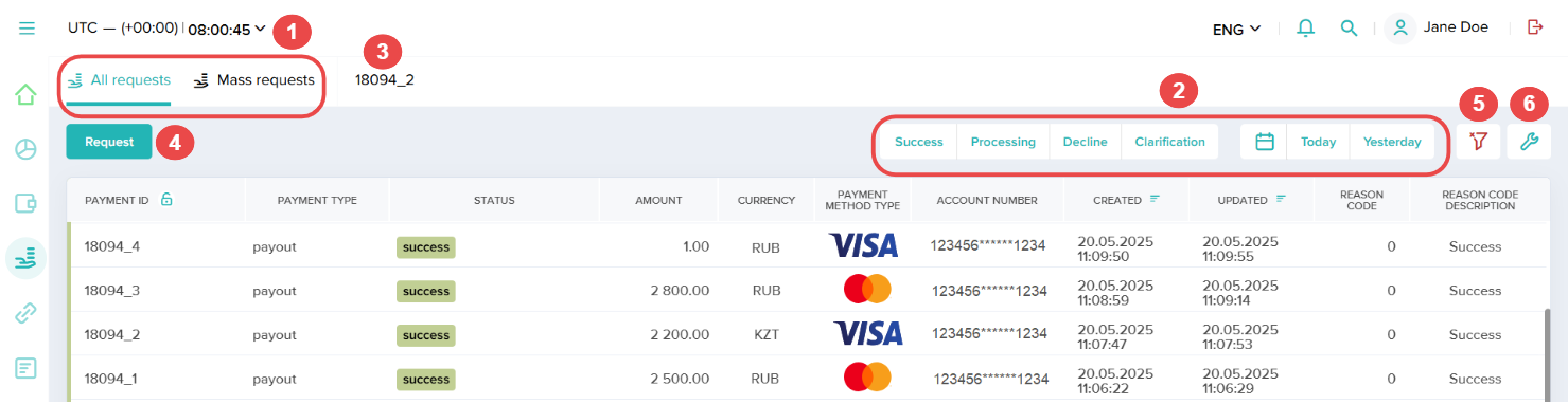 Dashboard implements lists to display large volumes of records with payment data or user account information. One section can contain one or several lists. To switch between them, use tabs with the names of the corresponding subsections.