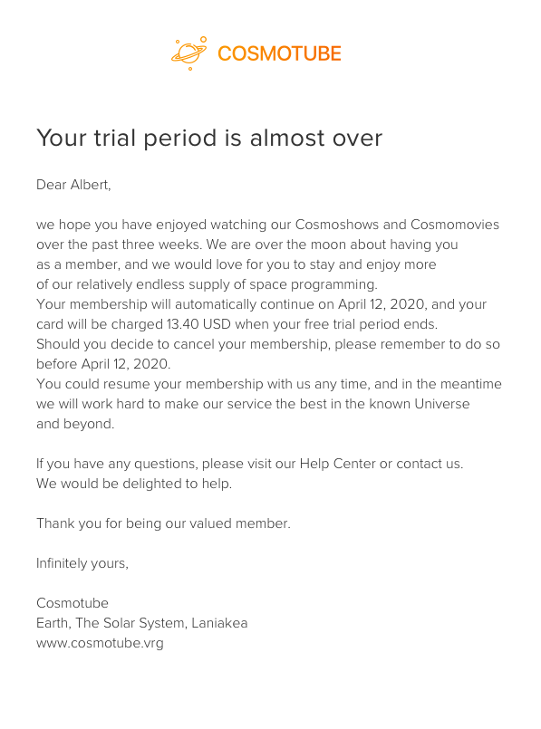 - Notification about the end of the free trial period which does not contain any elements of the standard template (except for the logo of the merchant).