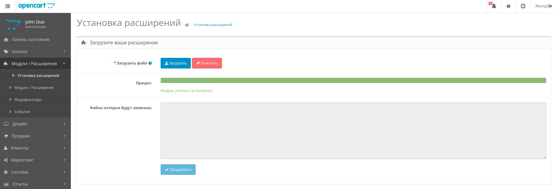 - Убедиться, что отобразилось сообщение: Модуль успешно установлен!