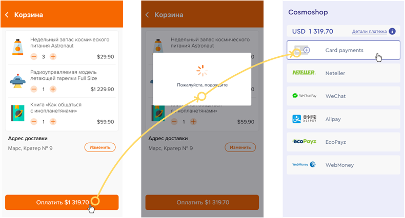 - Наборы средств разработки для мобильных приложений, работающих на платформах Android и iOS. Они встраиваются в клиентскую часть приложения и позволяют работать с платежной формой, адаптированной под мобильные интерфейсы (с поддержкой шагов 2 и 4 и без необходимости использования браузера на шагах 6–13).
