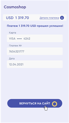 ), и с кнопкой возвращения к веб-сервису, если это необходимо. - Во втором случае итоговая страница Payment Page не используется и пользователь сразу перенаправляется к веб-сервису, где может получать итоговую информацию в произвольной форме — в соответствии с предпочтениями мерчанта и логикой работы веб-сервиса.
