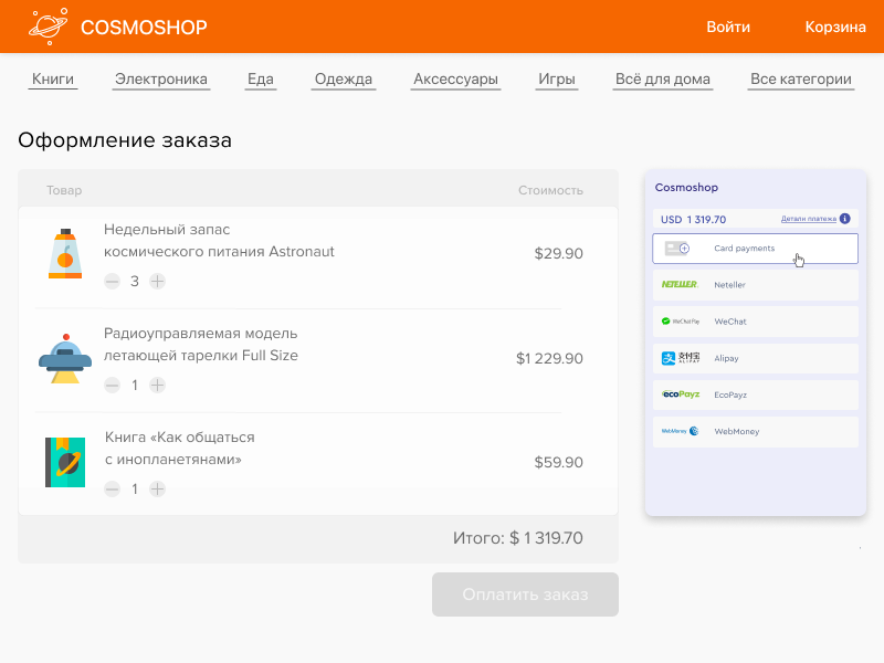 - Пользователь подтверждает готовность оплатить свой заказ, переходит на Payment Page