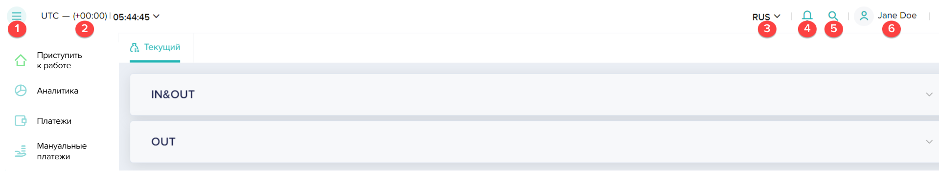 В левой части основного меню отображаются часы с возможностью выбора часового пояса. Этот выбор влияет на отображение данных в реестрах платежей, но не применяется для отсчета операционных дней. В отчетах всегда используется UTC + 00:00.