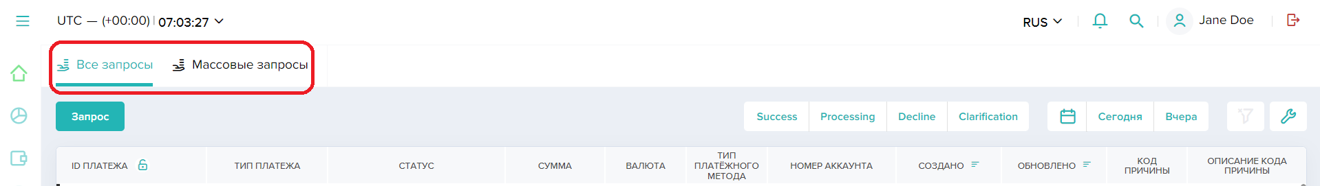 Для отображения массивов записей, например о платежах или учетных записях, в интерфейсе Dashboard используются реестры. В одном разделе могут быть представлены как один, так и несколько реестров. И для переключения между ними используются вкладки с названиями соответствующих подразделов.