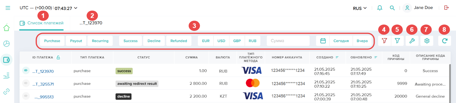 - Платежи — с реестром всех проведенных и проводимых платежей, инструментами для настройки отображения данных в реестре и возможностями просматривать детальную информацию о платежах и выполнять одиночные возвраты.