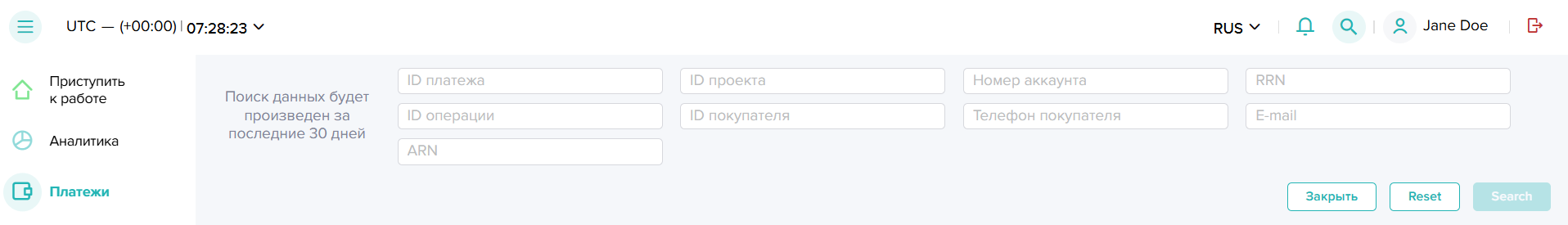 Панель поиска содержит заданный набор полей, через которые можно оперативно находить требуемые платежи. Для удобства пользователей и оптимизации скорости поиска на панель выведены наиболее востребованные параметры, а поиск осуществляется только по полному совпадению атрибутов. Результаты поиска отображаются в реестре платежей в разделе Платежи.