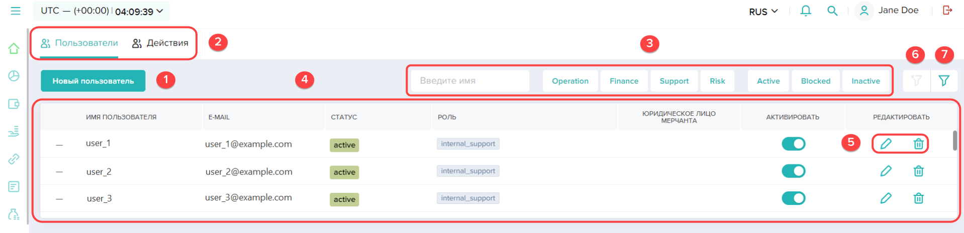 Все они устроены однотипно и при работе с ними можно настраивать состав и порядок столбцов, фильтровать записи и делать определенные действия, будь то переход к детальной информации о платеже или удаление учетной записи пользователя.