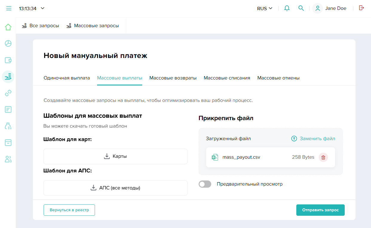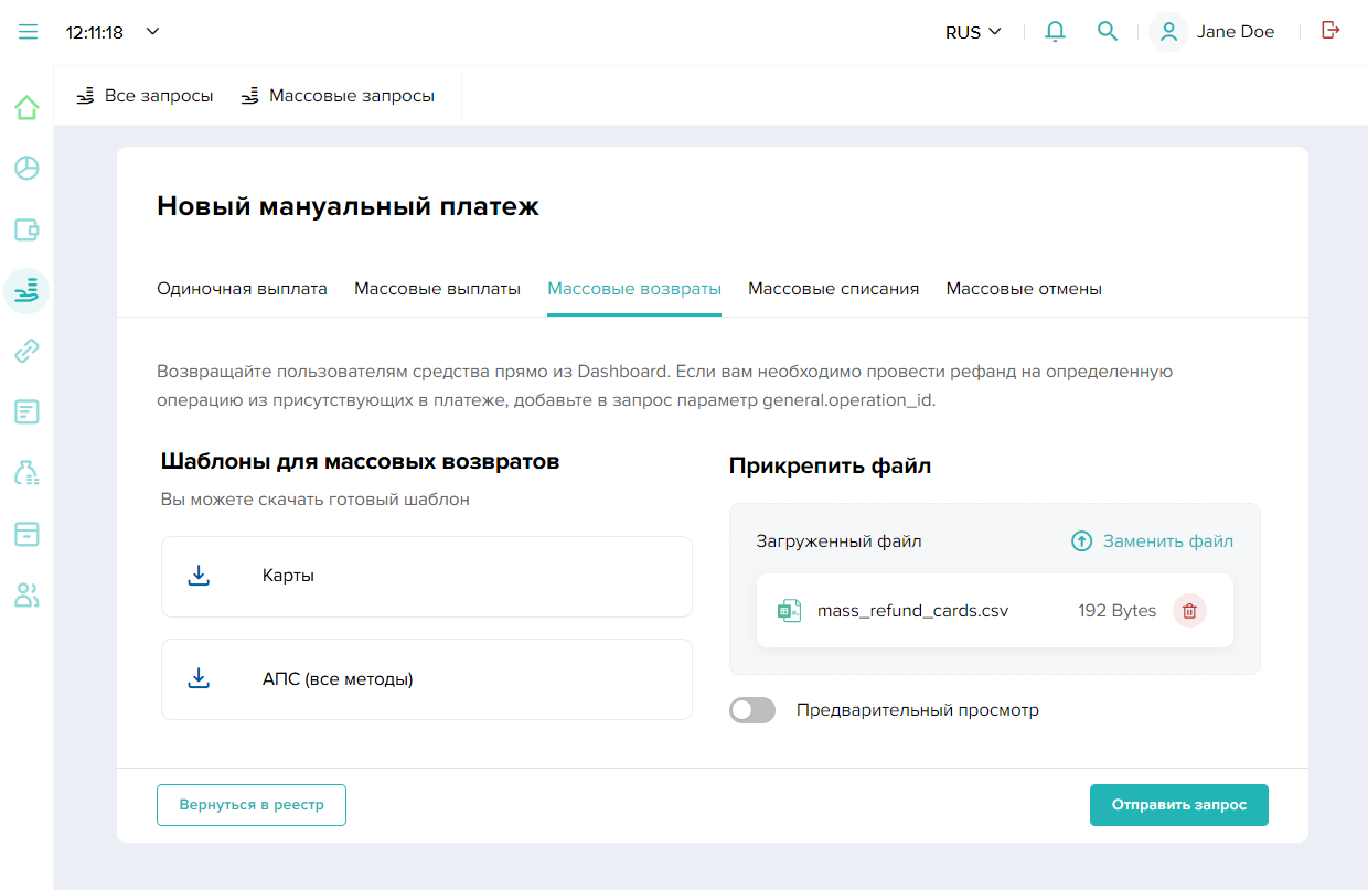 При подготовке файла для проведения массовых операций вы можете воспользоваться шаблонами, доступными для загрузки в интерфейсе Dashboard на вкладке массовых операций. Загрузив необходимый шаблон, заполните его в любом редакторе файлов формата CSV, например Microsoft Excel. Обратите внимание, что набор параметров в шаблонах может варьироваться в зависимости от типа платежа или платежного метода.