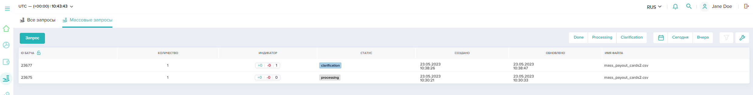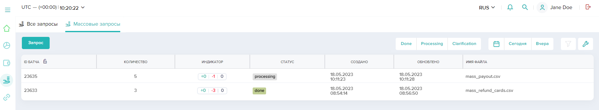 - массовый — с указанием параметров через загрузку файла заданного формата и с отправкой и выполнением пакета запросов (из файла) на произвольное количество операций.
