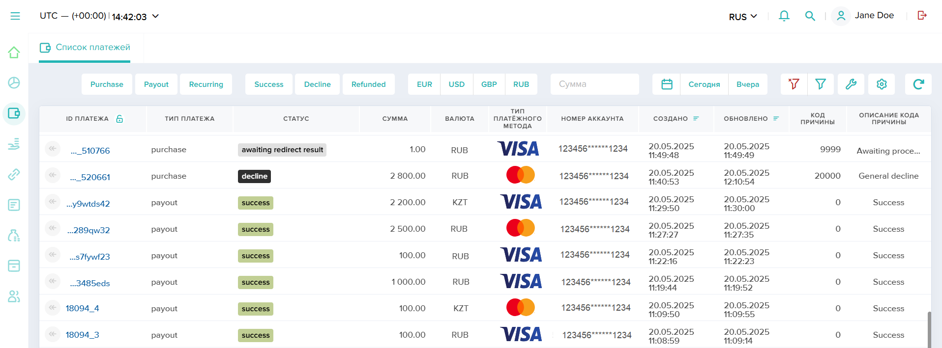 Для контроля проведения платежей в разделах Платежи и Мануальные платежи доступны реестры с возможностью фильтрации данных, и в этих реестрах поддерживается возможность просматривать детальную информацию об отдельных платежах через их карточки. При этом карточки платежей открываются в отдельных внутренних вкладках раздела, что позволяет оперативно переключаться между ними и общим реестром.