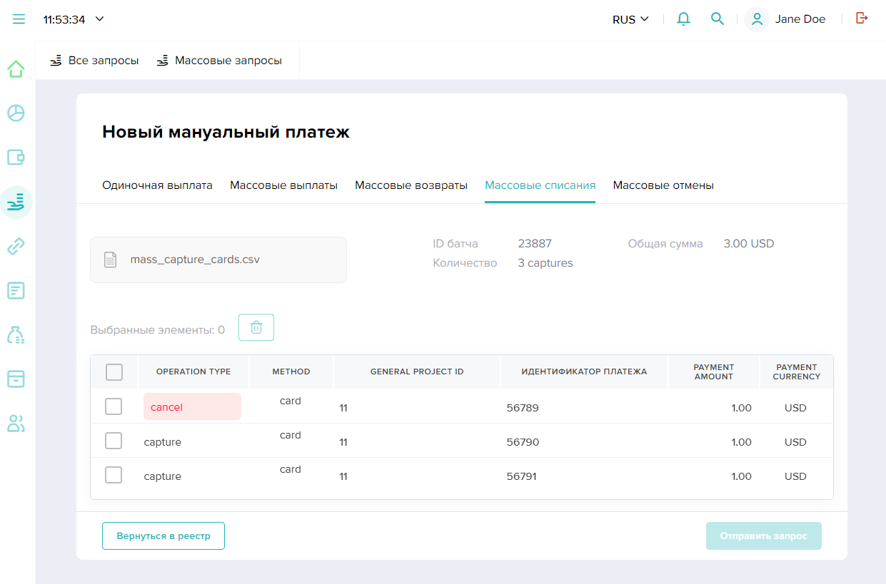 , а сумму подтверждения (отмены) может составлять как полная, так и частичная сумма заблокированных средств. При изменении суммы заблокированных средств следует учитывать, что такая возможность поддерживается не во всех случаях (в соответствии с региональными и другими особенностями) и с учетом ограничений со стороны платежных систем (подробнее — в разделе Оплата в две стадии). - Перейти на вкладку Массовые списания (Массовые отмены).