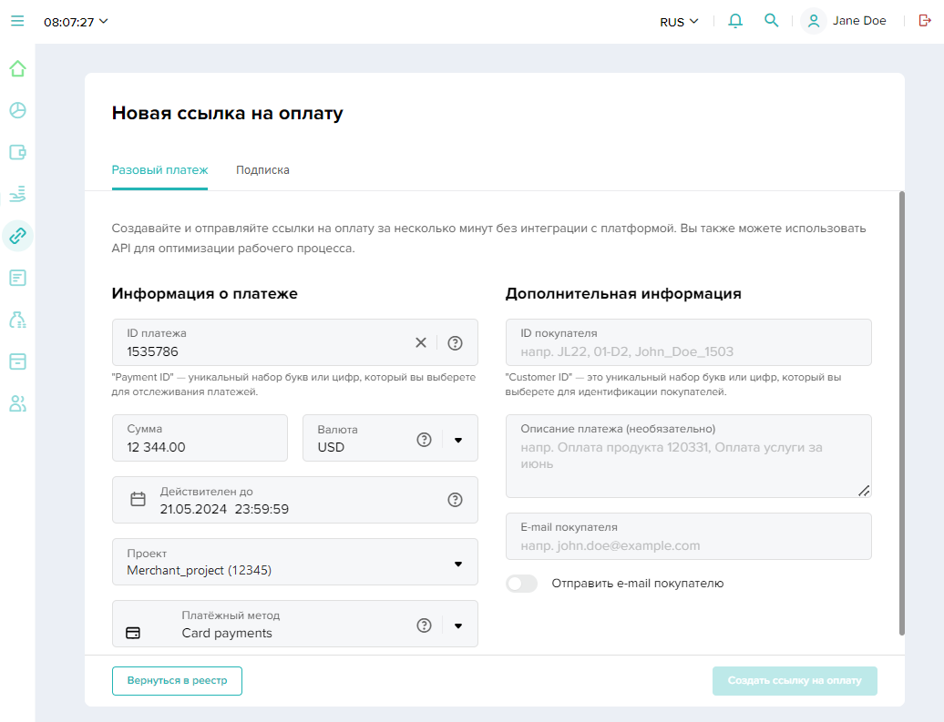 Для этого необходимо открыть раздел Ссылки на оплату и щелкнуть кнопку Новая ссылка на оплату слева на панели фильтрации.