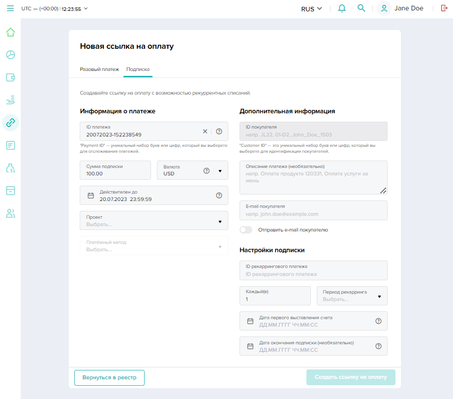 Чтобы провести оплату с использованием платежной ссылки с последующими регулярными оплатами (подпиской), следует: