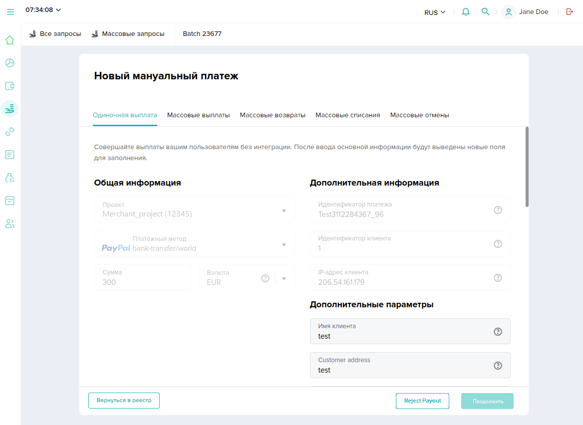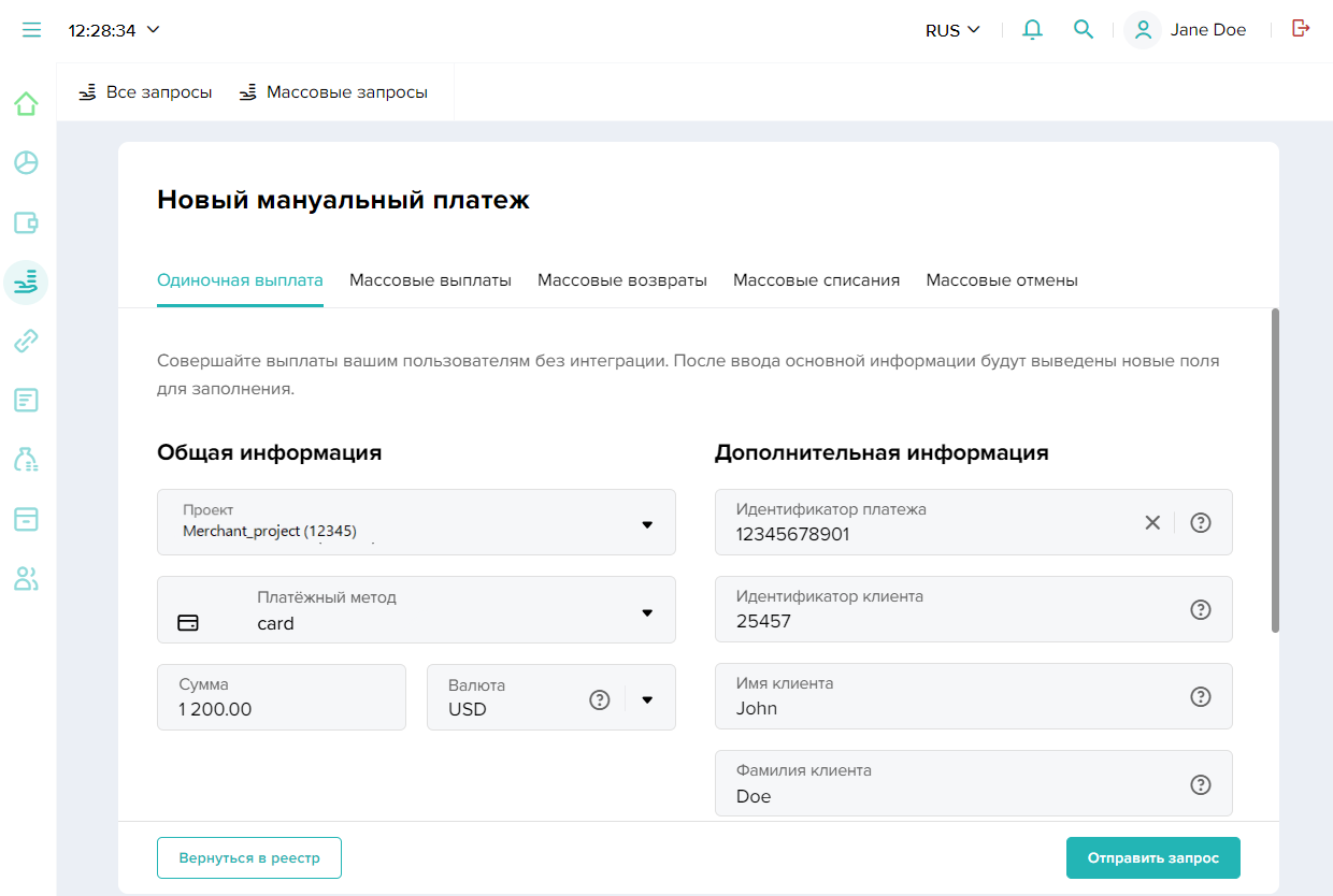 - Мануальные платежи — для работы с выплатами, а также с групповыми подтверждениями и отменами списаний по двухстадийным оплатам и групповыми возвратами и выплатами.