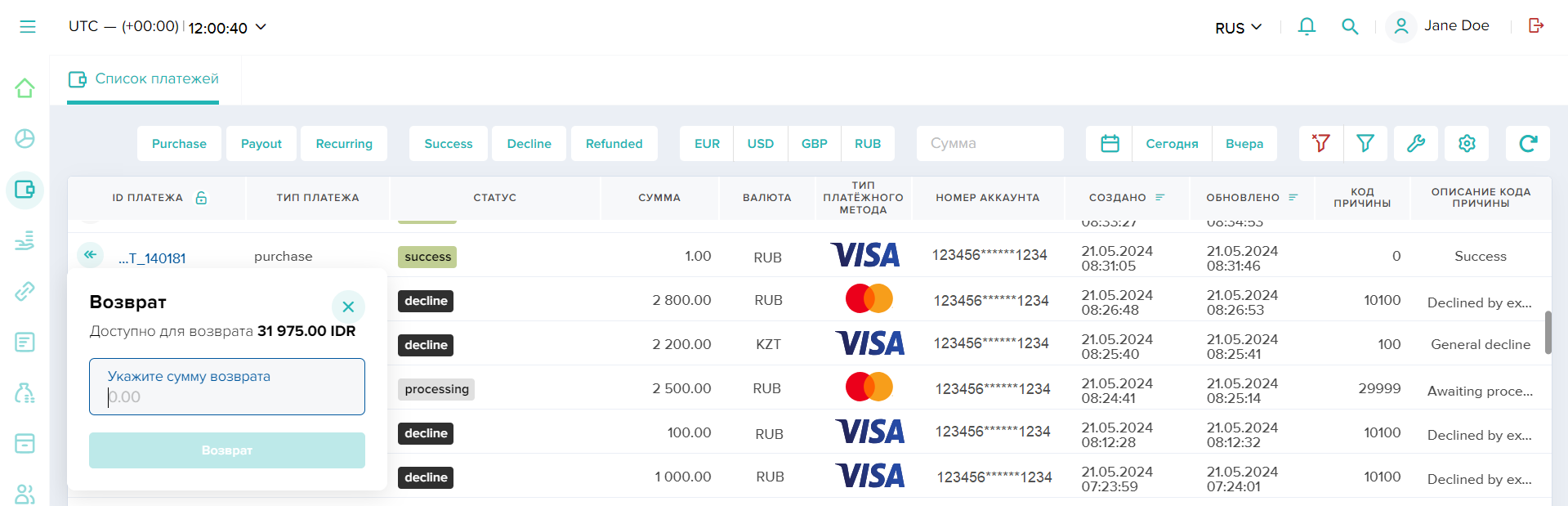 будет относиться к сумме в 100 EUR, а сумма возврата и оставшиеся средства будут отображаться в полях Возвращено и Доступно для возврата.Другой пример — регулярная оплата с серией списаний в одном платеже. Для такой оплаты в поле Сумма отображается актуальная сумма всех поступивших средств.