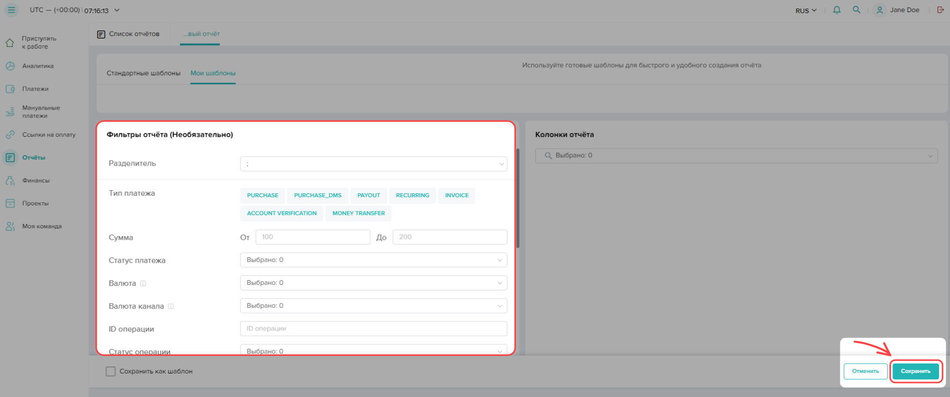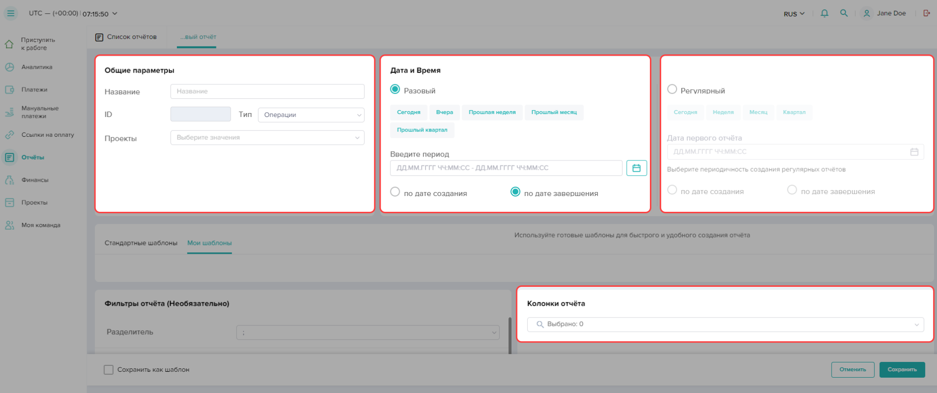 Вы можете сохранять параметры и фильтры отчета в качестве шаблона, поставив флажок рядом с обозначением Сохранить как шаблон в левом нижнем углу интерфейса. Сохраненный шаблон появится на панели Мои шаблоны при создании нового отчета.