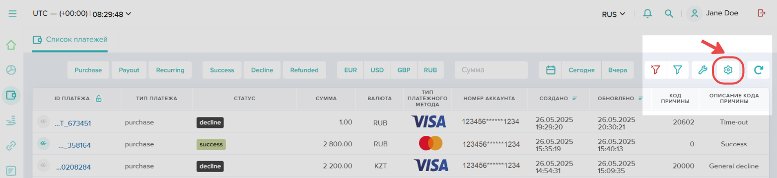 - Перейдите в раздел Платежи. Щелкните кнопку со значком шестеренки в правом верхнем углу.