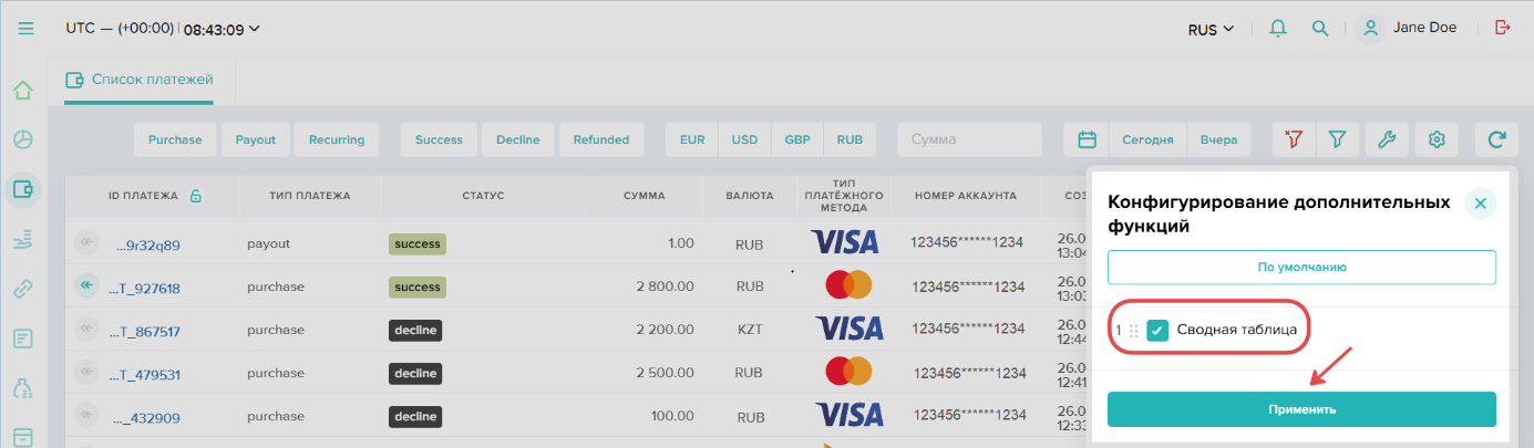 Также в интерфейсе Dashboard есть возможность отображать сводную информацию по платежам за определенный период в виде панели, расположенной в нижней части реестра платежей.
