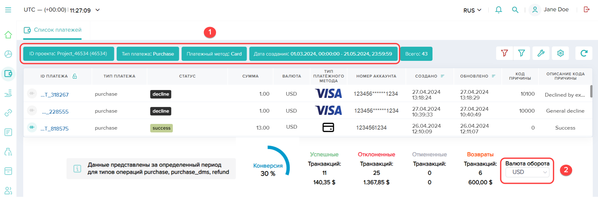 ); - выбор платежного метода становится доступным после указания идентификатора платежа и проекта;