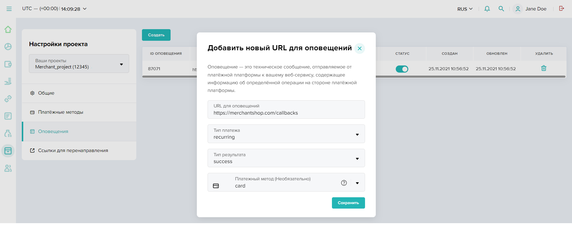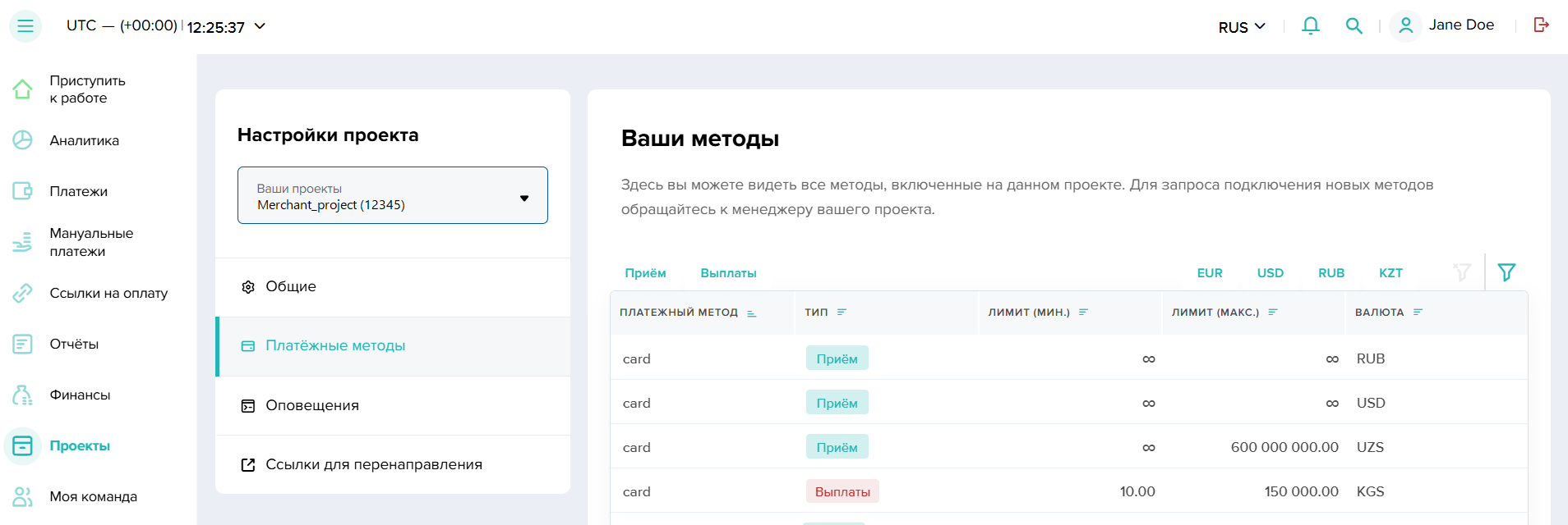 Рис. 2. Отображение платежных методов, доступных для проекта, с лимитами сумм, валютами и типами операций - Оповещения — для настройки правил отправки оповещений;