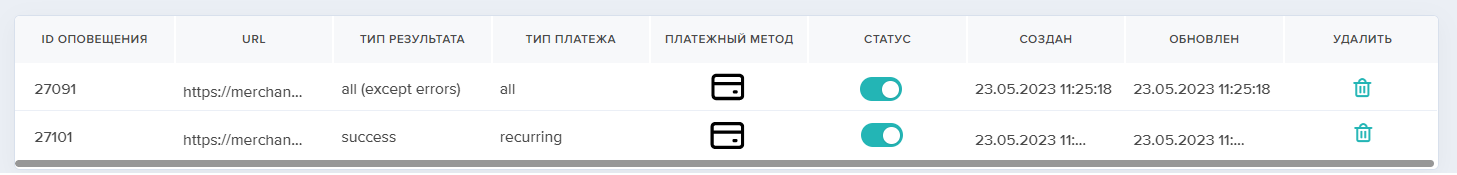 - В реестре отображаются правила отправки оповещений для всех указанных типов платежей и результатов, но управление некоторыми из этих правил возможно только через сотрудников технической поддержки PSPHost. К таким правилам относятся правила для платежей типа