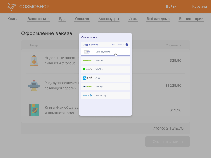 Открытие платежной страницы в модальном окне